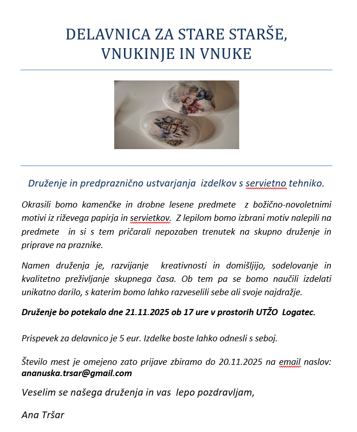 Spoštovani člani in članice, ta petek naredite veselje svojim vnukom in jih pripeljite na delavnico. Lepo se boste imeli in skupaj ustvarjali. Vabilo je v