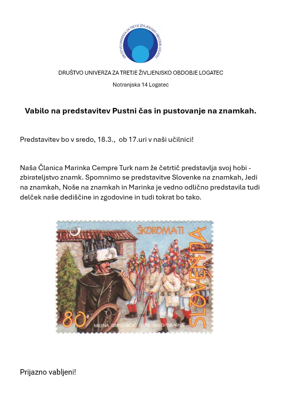 Vabilo na predavanje člana UTŽO Logatec Staneta Gnezda iz Rakeka POHOD PO CAMINU di ASSISI ki bo v sredo, 18.2., ob 17. uri v učilnici