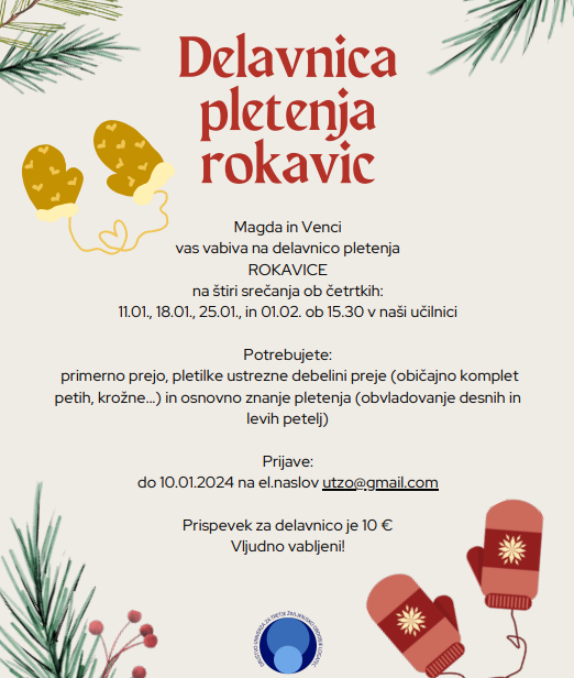 Pozdravljeni, v četrtek se začne delavnica pletenje rokavičk, še se lahko prijavite, prihaja mraz! Metka