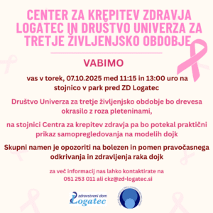 Pozdravljene članice in člani UTŽO Logatec, Skupina Kvačkanje je okrasila logaško rožnato drevo, da nas spomni, da poskrbimo za svoje zdravje, saj je oktober mesec